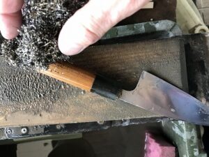 1、包丁の付け根部分のサビを取ります。