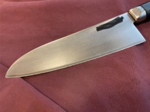 出刃包丁などの鋼の包丁は少し使わないでいるとすぐにサビが出ます。サビも程度によるのですが、画像のような感じですと十分に綺麗になります。表面のサビなら、ご家庭でも十分に取れます。これよりひどくなりますと、サビが鋼のの奥に侵攻して、場所によっては使用できないという事にもなります。