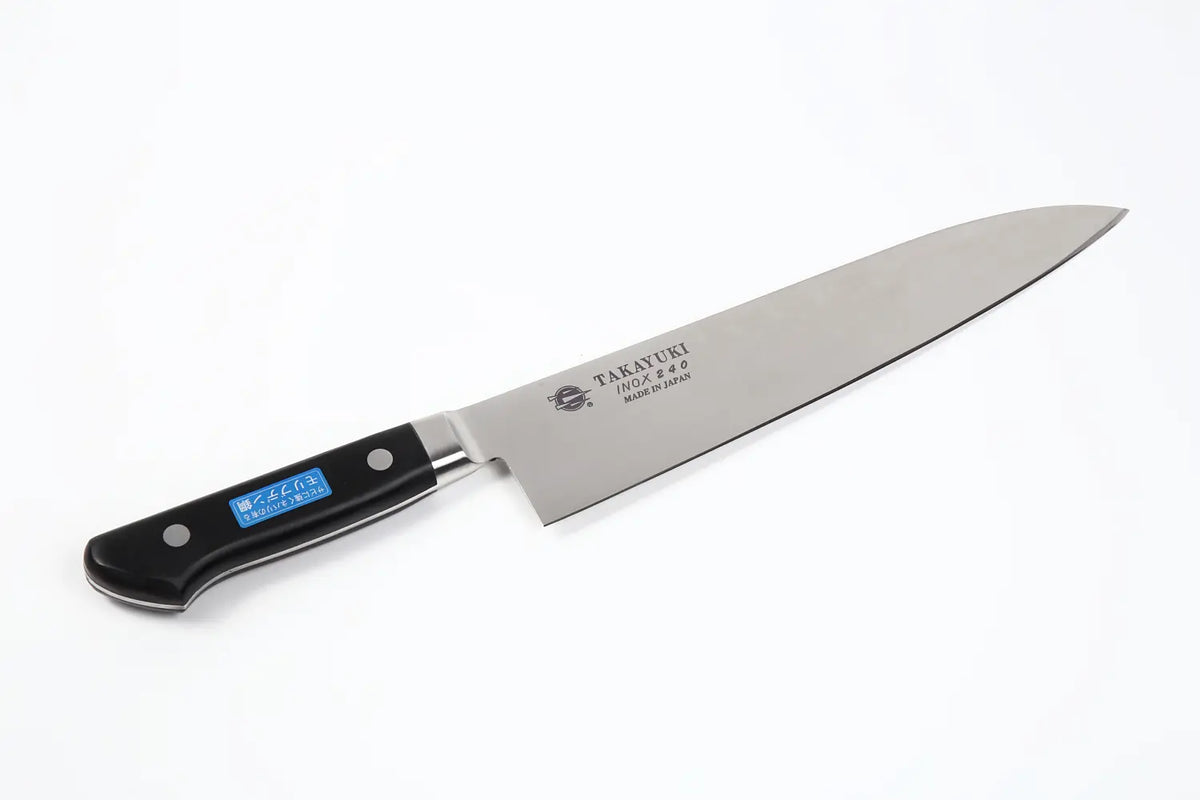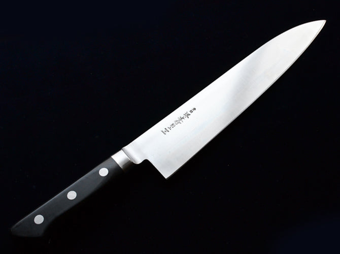 堺孝行の洋包丁のなかでも、最もバリエーションが多く、調理に携わる多くの人に指示されてきました。昔の圧縮合板からポリエチレン樹脂の柄にかわり、衛生面も耐久面力を増しました。ツバ付ですが価格を低く抑え、多くの人に使っていただきたいという意思表示が表れています。そのため、定番の普及品となっています。