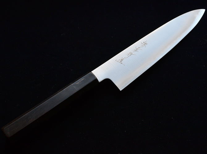 銀三鋼を刃金にしてステンレスにわりこみました。刃の厚みを薄くしていますのでスムーズな刃の入りが期待できます。鍛造ですので、切れ味鋭く、長切れします。錆びないため取り扱いも大変楽です。柄は黒檀の水牛柄です。永く飽きずに使える、1ランク、2ランク上の包丁です。満足の逸品です。